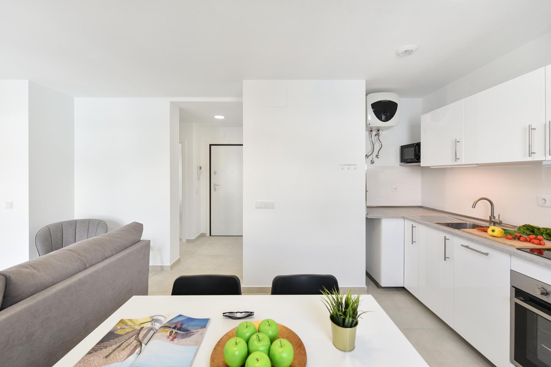 Open-plan kitchen with oven, virtoceramic cooktop, dishwasher and basic cooking utensils.