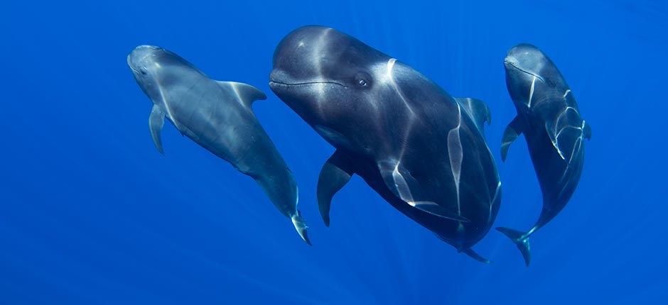 - Großer Tümmler (Tursiops truncatus): Die bekannteste Delfinart kann leicht in unmittelbarer Nähe der Küste Gran Canarias gefunden werden. Ihre durchschnittliche Größe beträgt 2,7 Meter bei den Männchen und 2,5 Meter bei den Weibchen, obwohl einige der ältesten sogar größer als 3 Meter sind. Sie leben in Gruppen von 10 bis 30 Exemplaren und haben eine dunkelgraue Farbe auf dem Rücken, die zu den unteren Bereichen hin allmählich verblasst.