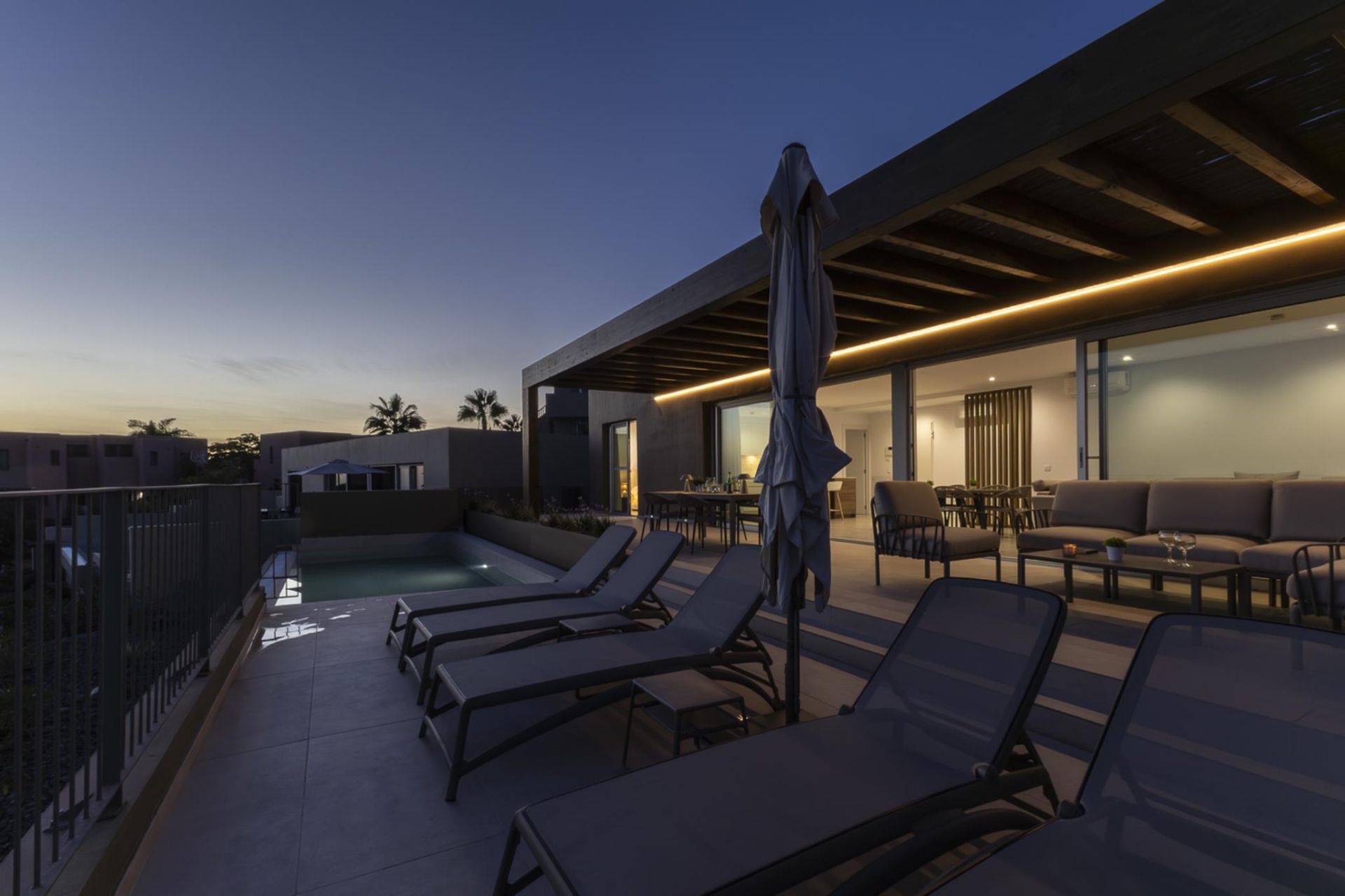 - Privater Pool, großzügiger Sitzbereich im Freien, 6 Sonnenliegen und Sonnenschirme sowie eine herrliche Terrasse mit Aussicht.