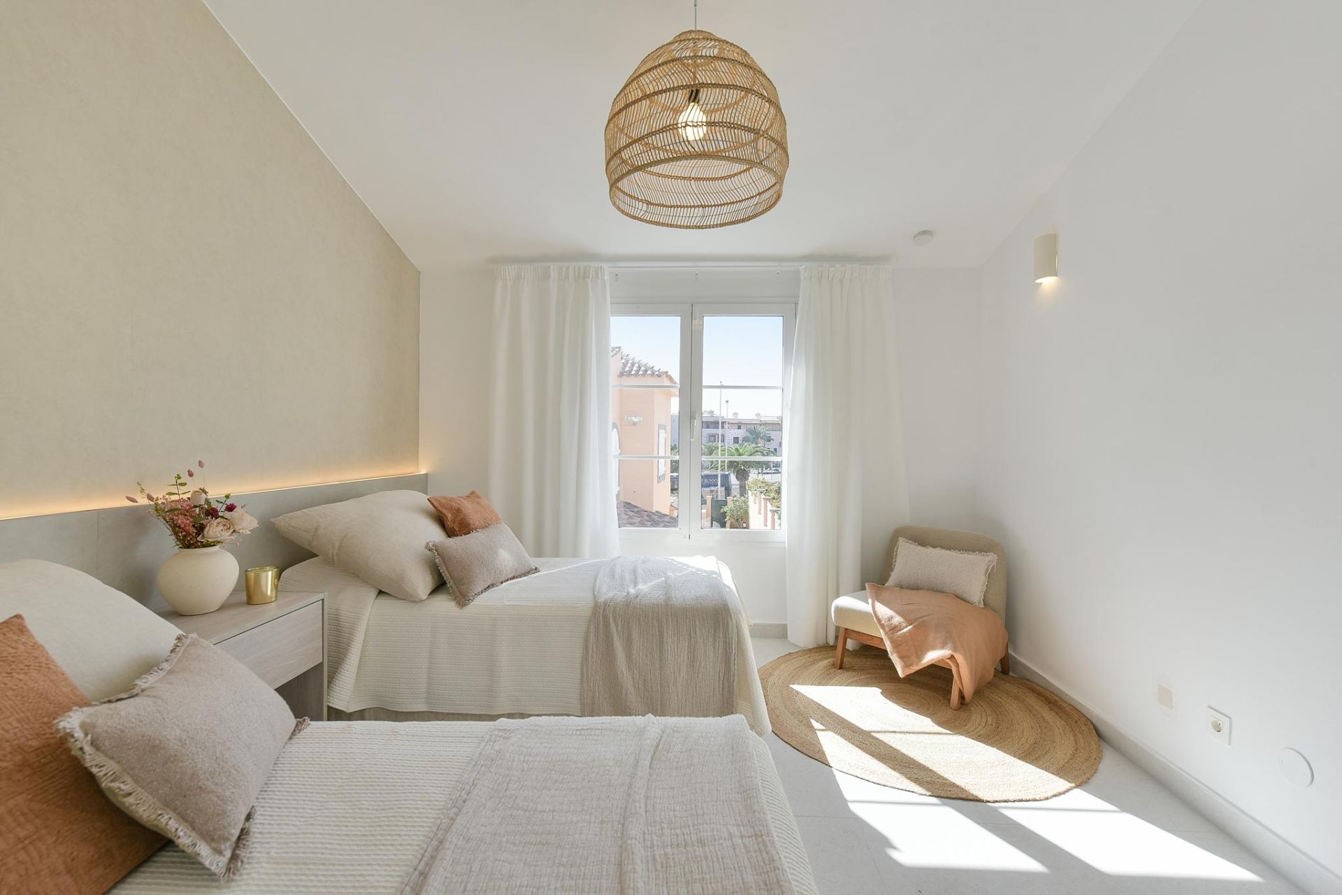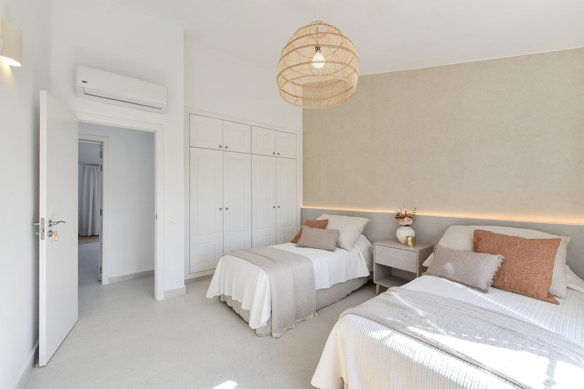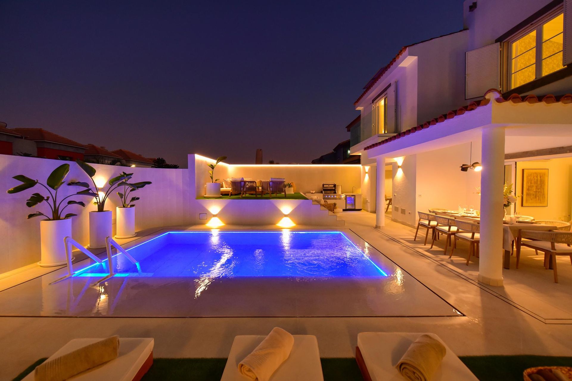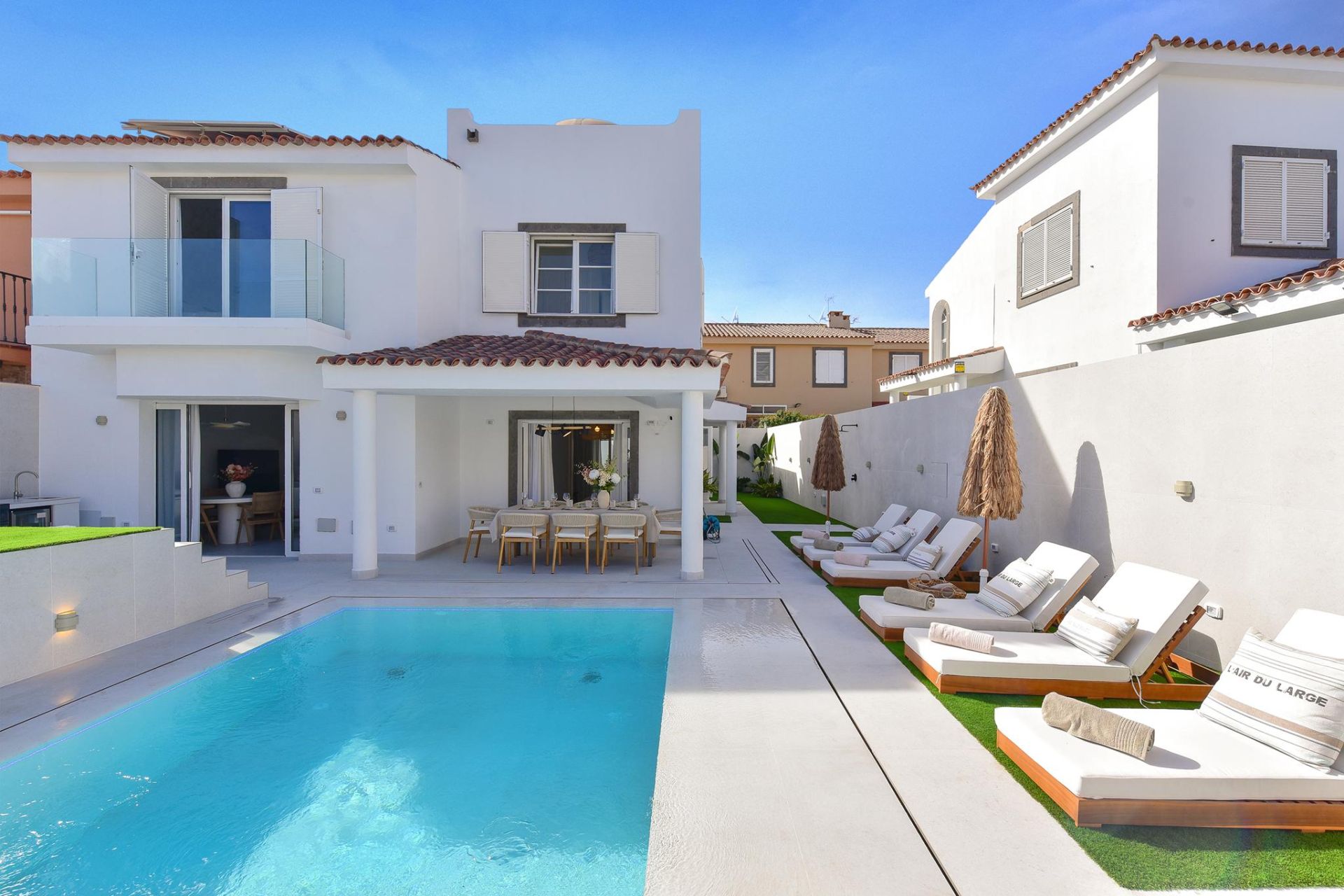 Diese Ferienunterkunft ist auf 2 Stockwerke und Untergeschoss verteilt, mit 4 Schlafzimmern, eines davon mit Doppelbett und direktem Zugang zur Terrasse und zum privaten Pool, der Rest mit je zwei Einzelbetten, verfügt auch über 4 Badezimmer, eines davon mit Badewanne. Die große Terrasse verfügt über einen Essbereich im Freien mit einem Grill, Sonnenliegen und einem beheizbaren Swimmingpool (gegen Aufpreis).