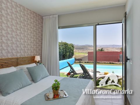 Es handelt sich um eine vollständig private Ferienunterkunft, die aus zwei Doppelzimmern besteht; das Hauptschlafzimmer mit Doppelbett, Ankleidezimmer und Badezimmer mit Dusche. Das zweite Schlafzimmer hat zwei Einzelbetten und ein separates zweites Badezimmer mit Dusche. Beide Schlafzimmer haben durch große Fenster direkten Zugang zum Garten und zum Swimmingpool und bieten so eine herrliche Aussicht auf den Außenbereich. Diese exklusive Unterkunft wird für Familien mit Kleinkindern oder Personen mit eingeschränkter Mobilität empfohlen, da sie im Inneren keine Treppe hat.