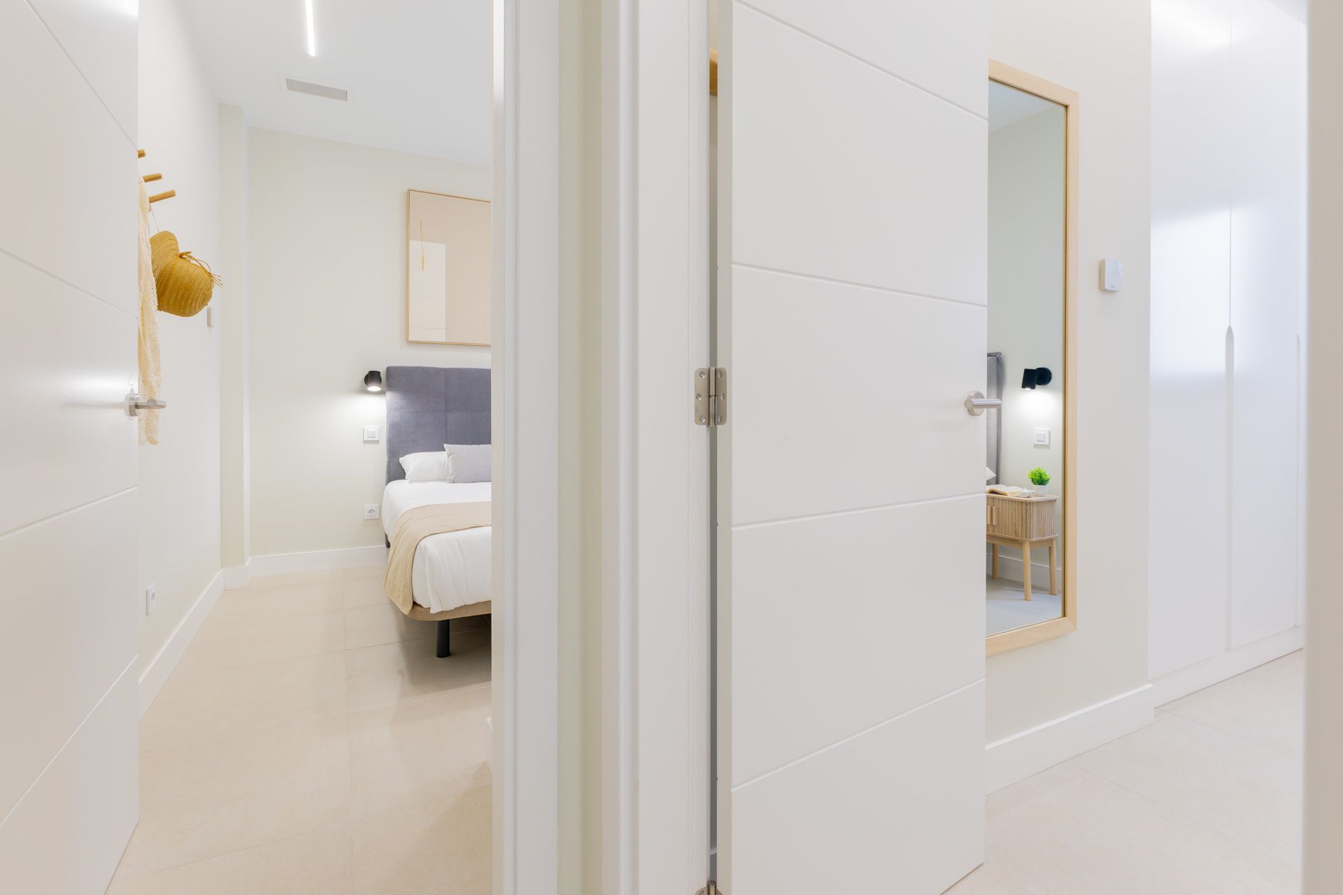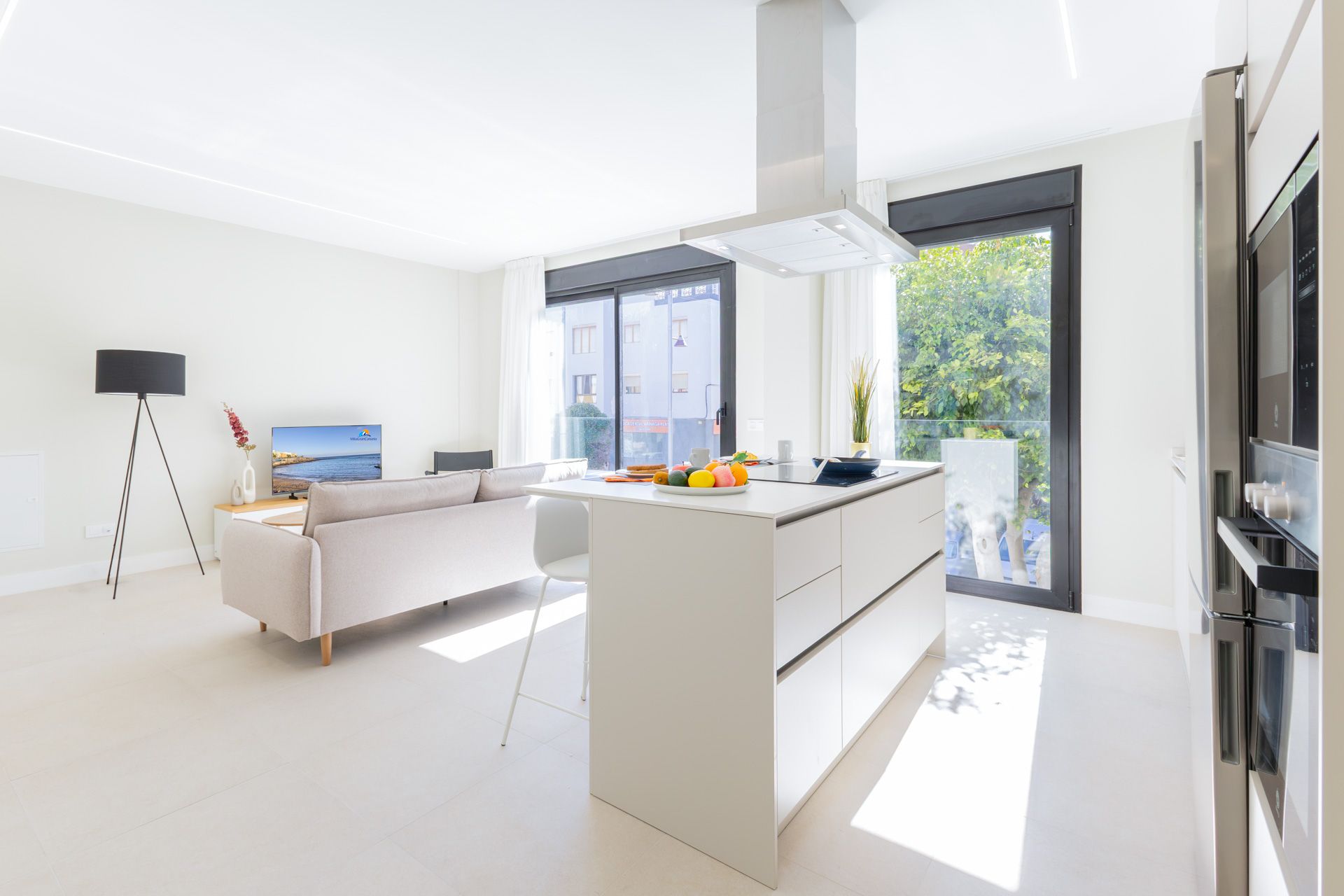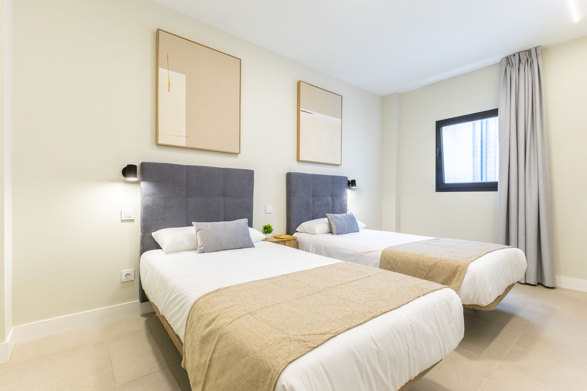 El apartamento tiene capacidad para 4 huéspedes y dispone de dos dormitorios (uno con cama doble y otro con dos camas individuales), dos baños con ducha, una luminosa zona de salón-comedor y una cocina básica equipada. Un cuarto de lavandería privado en la azotea, con lavadora individual, lo hace especialmente práctico para estancias más largas.