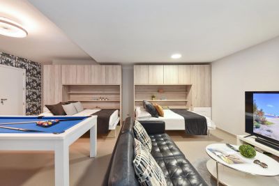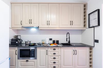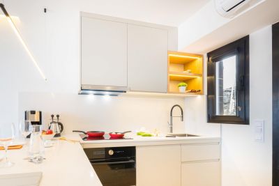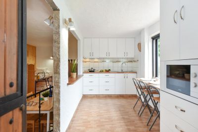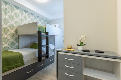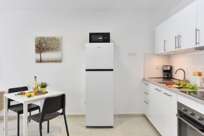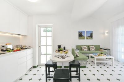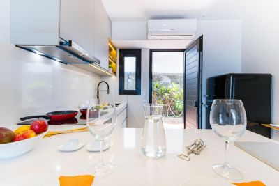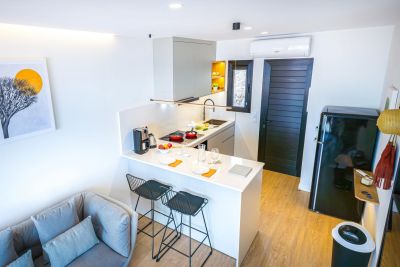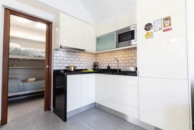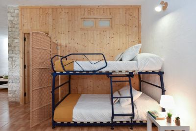 Nasas 1 tiene 2 dormitorios, uno con cama de matrimonio y el otro con dos camas individuales, un baño con ducha y una cocina independiente equipada con cafetera, microondas, utensilios de cocina y lavadora.