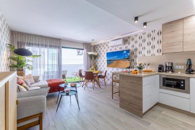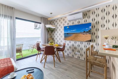 Apartamento en planta baja junto a La Charca de Maspalomas con terraza, 1 dormitorio, Smart TV y cocina. Ideal para parejas cerca de dunas y playa.