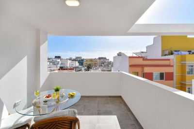Luminoso apartamento de 2 dormitorios con terraza y vistas a la ciudad, a pocos pasos de la playa de Las Canteras. Ideal para amigos, parejas y teletrabajo, con Wi-Fi gratis.