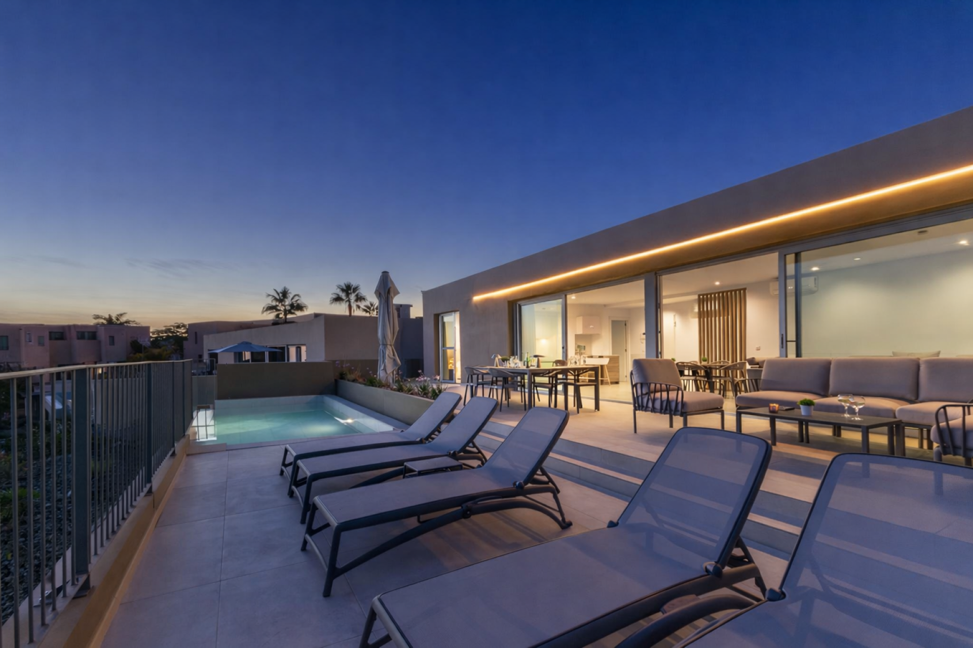 La villa dispose d’agréables espaces extérieurs avec vue ouverte sur Salobre Golf, parfaits pour se détendre, prendre le soleil ou partager des repas en plein air en toute tranquillité.