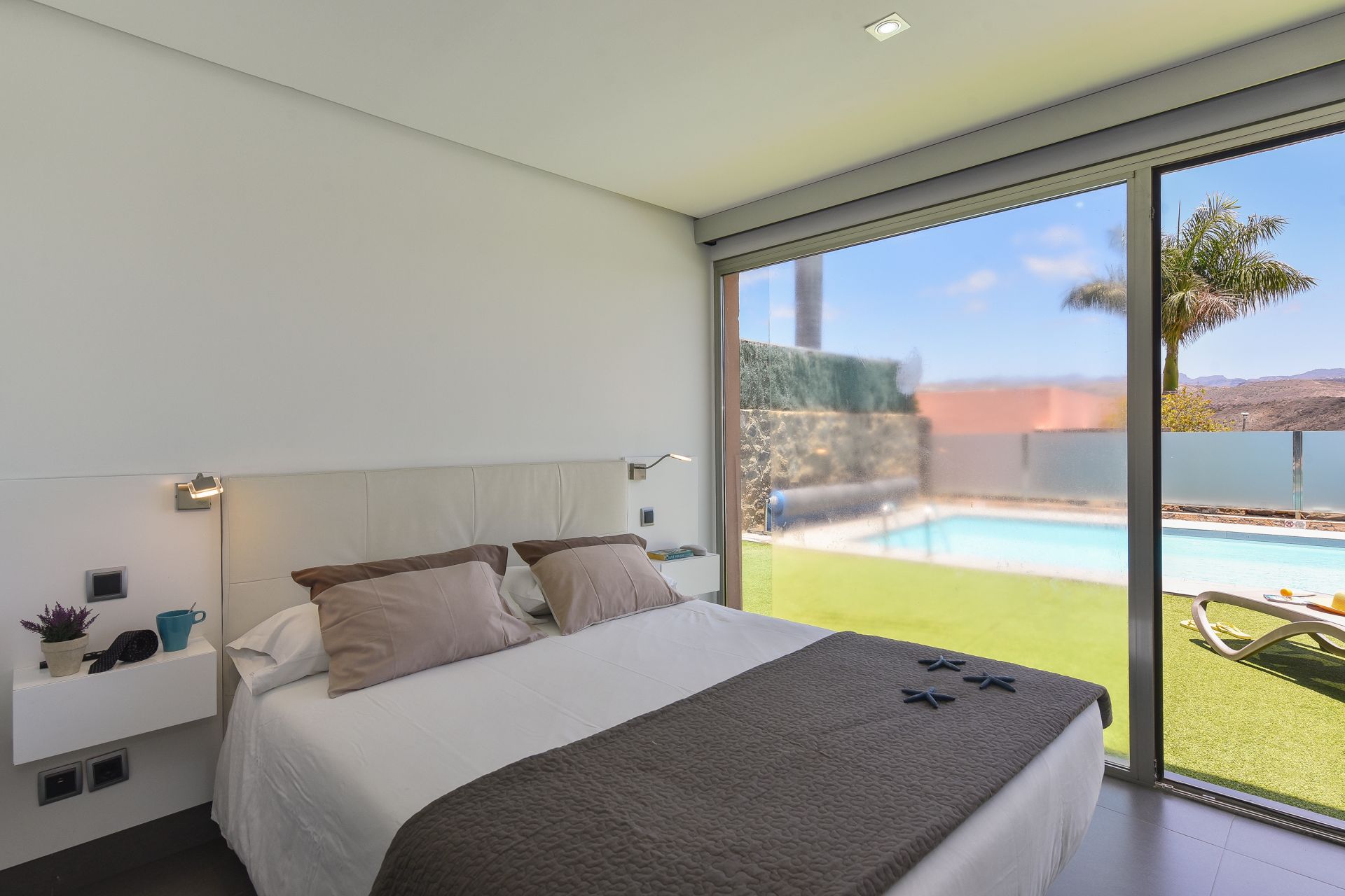 Grandes portes coulissantes avec accès direct à la piscine et au jardin (200m2) et la chambre principale avec un grand lit double. Le deuxième a 2 lits simples confortables. Les deux ont été conçus pour offrir le repos parfait après une journée de visites à Gran Canaria ou prendre un bain de soleil à Maspalomas Beach (10 minutes en voiture de Salobre Golf Resort).
